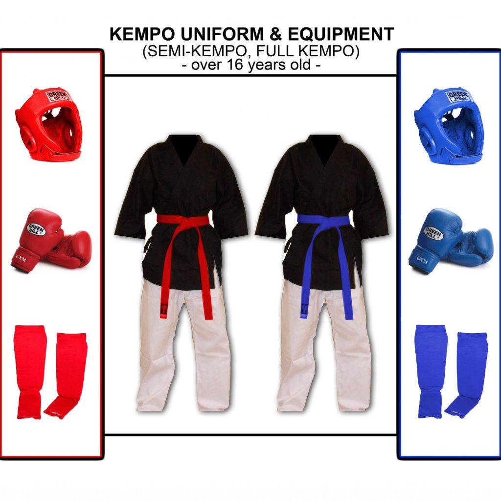 Gear: Black gi, colored belts, boxing gloves (8-10oz), shin guards, protective vest, headgear with mask.